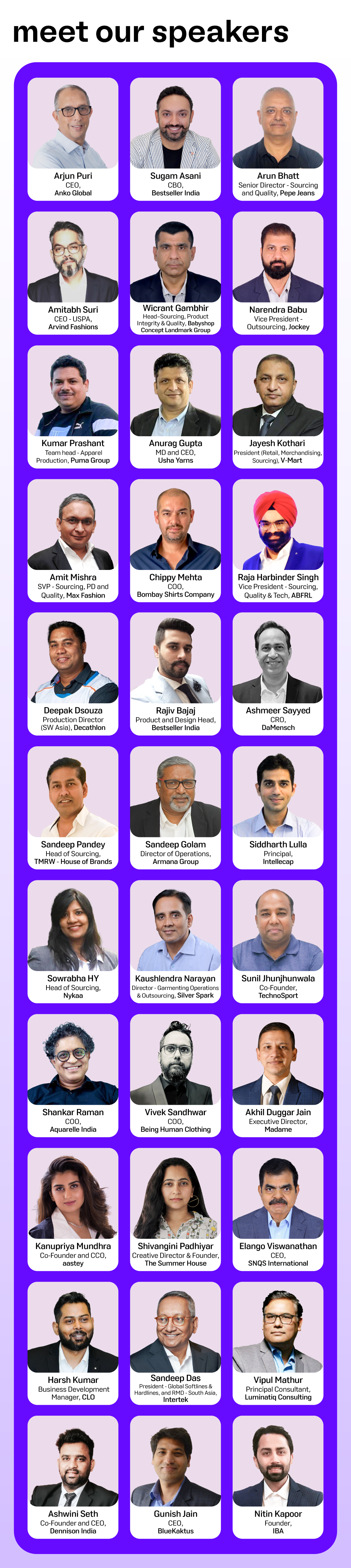 Our initial line-up features renowned industry leaders who will discuss about a spectrum of topics like Sustainability, Sourcing, Trend Forecasting, Emerging Markets, Denim Innovations and many more. Join us as we delve into the future of fashion and explore groundbreaking ideas that will shape the industry for years to come. Presenting our first set of distinguished speakers: