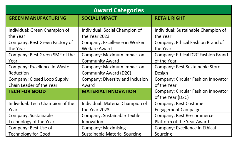 The event will host Panel Discussions by industry leaders, Offline Presentation of live case studies demonstrating actual, measurable turnarounds and transformations during the day followed by SustainableNXT awards in the evening on Day-1 of Apparel Sourcing Week- 20 July 2023. It will recognise sustainable efforts of 25 individuals and companies across 5 below mentioned categories: